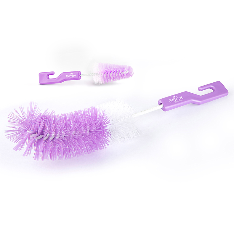 a savičky BAYBY BBA 6404 fialové barvy. Balení obsahuje větší kartáč na láhve a menší